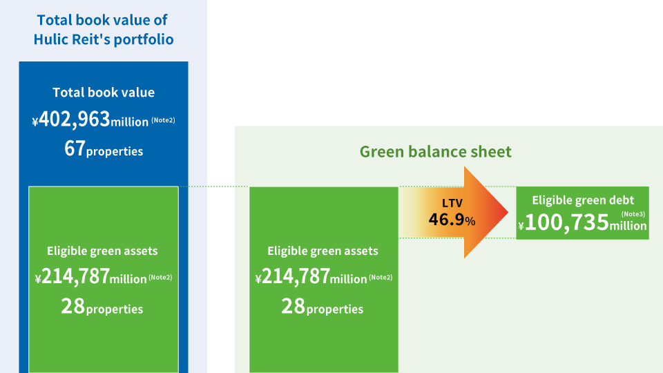 The amount of debt calculated by multiplying total estimated book value of eligible green assets, which relates to Hulic Reit’s portfolio at the end of each fiscal period, by the ratio of interest-bearing debt to total assets (“amount of eligible green debt”), will be set as the upper limit amount for green finance and managed so that the balance of green finance does not exceed the amount of eligible green debt as of the end of each fiscal period.